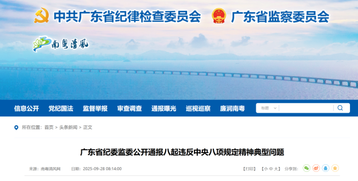 国庆、中秋节假将至,为进一步严明纪律,加强警示教育,广东省纪委监委于今天(9月28日)对8起违反中央八项规定精神典型问题进行公开通报。其中,珠海航城文化产业发展有限公司原党支部书记、董事长钟穗,因违规组织公款宴请、接受娱乐活动安排问题被通报。